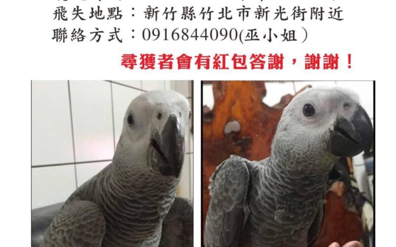 尋找非洲灰鸚鵡~灰哥 地點 新竹縣竹北市 Zhubei , Hsinchu ,African grey parrot