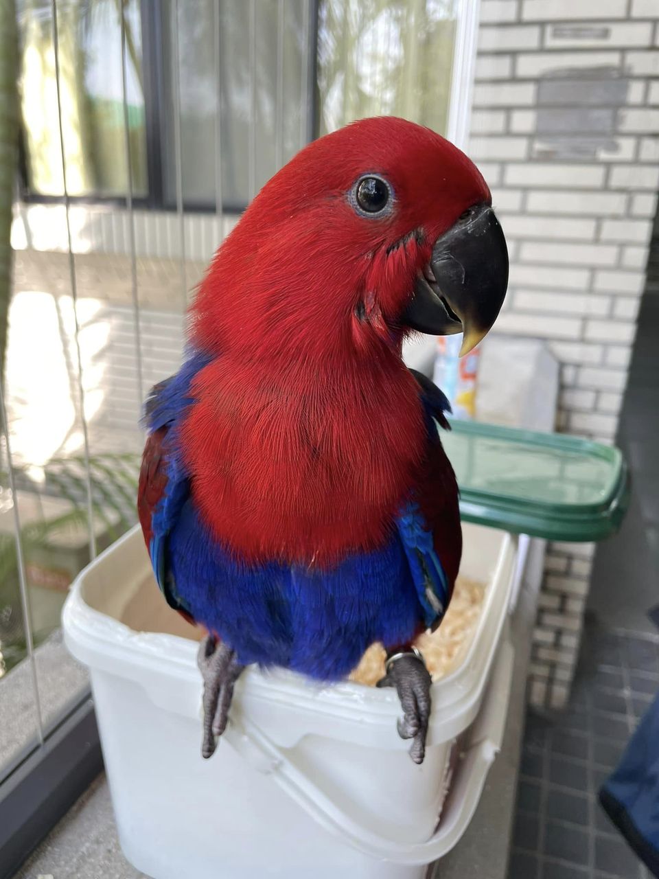 請問有人看到一隻紅色鸚鵡嗎?有兩個腳環 一個是白鐵死環 一個是金色流水編號環