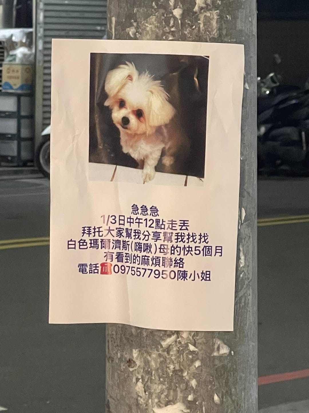 急急急 1/3 日中午 12 點走丟 拜託大家幫我分享幫我找找 白色瑪爾濟斯(嗨啾)母的快 5 個月 有看到的麻煩… https://twpetsearch.arlinks.net/2026/01/north-taichung.html