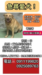 外形:黃色長毛中型犬,個性親人但有一點膽小,走失時身上沒有衣物項圈。