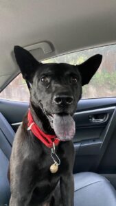 舌頭全黑下巴有長一點白毛 臉上有一些疤 身型偏瘦 中型犬 腿長 立耳朵 瞳孔顏色非常棕