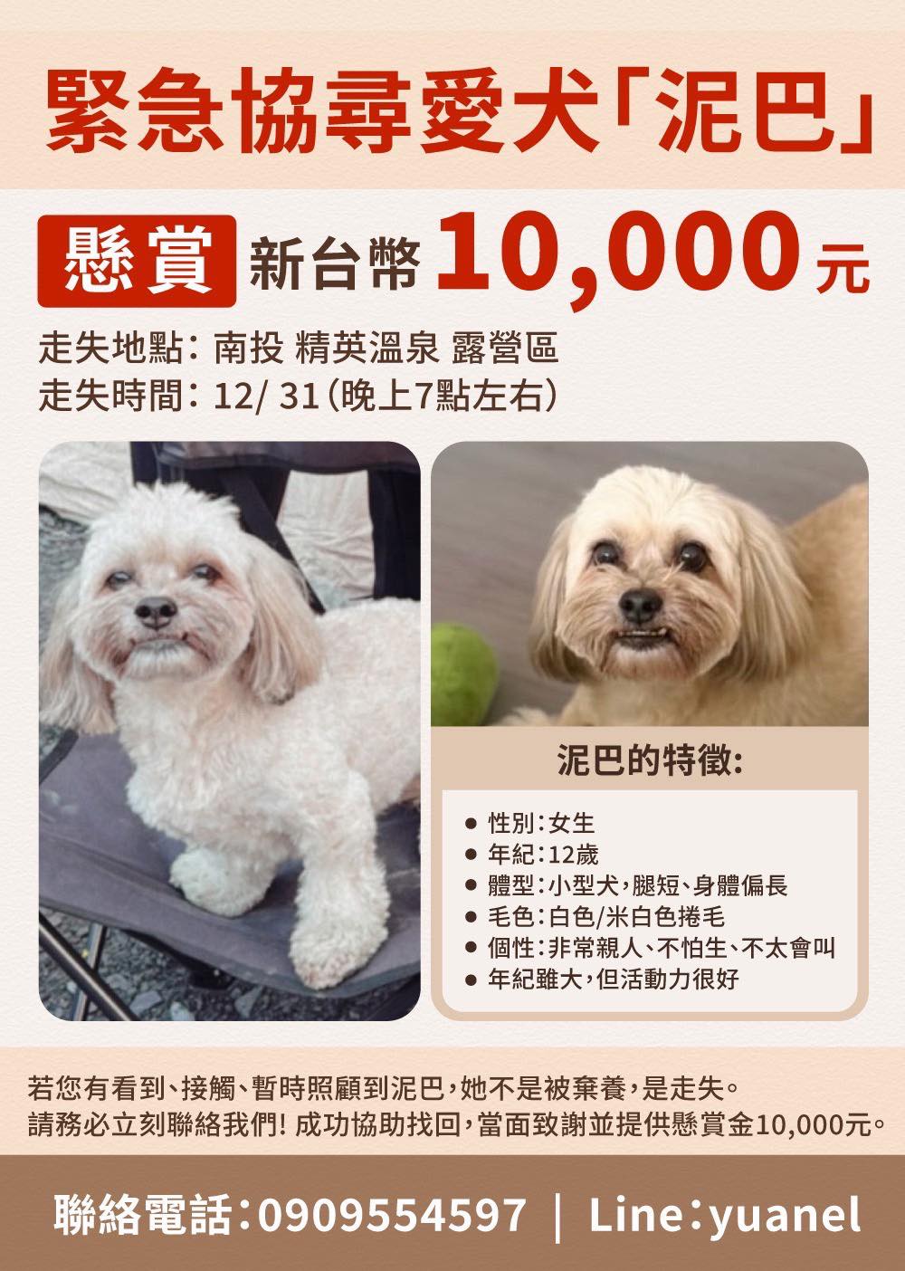轉貼內容 被別的狗狗嚇到 在精英溫泉躲起來了 因為平常都會帶著她一起爬山 躲到山裡機會比較高 他不太喜歡水 所以比較不會往下走 從12/31晚上走失到1/2中午之間都有在尋找 現在先回家… https://twpetsearch.arlinks.net/2026/01/taian-miaoli.html