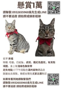 走失時身上有紅色圍兜、淺綠色胸背帶、貝殼項圈。