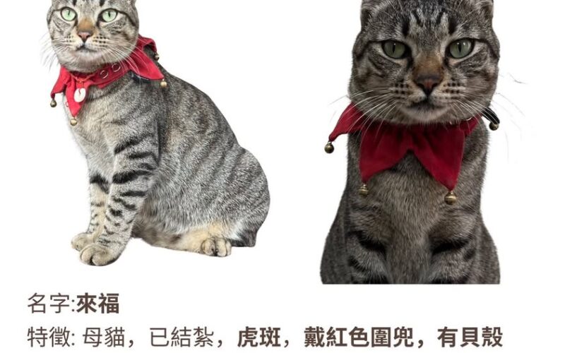 特徵:虎斑,嘴巴右邊有一個黑痕,大耳朵、方臉。是已結紮的母貓。