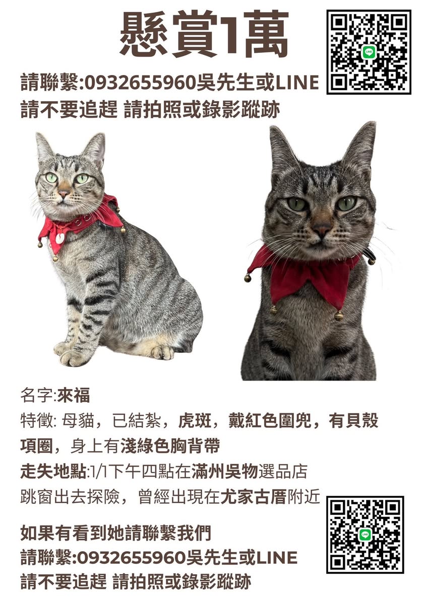 轉貼內容 《尋貓》 懸賞1萬 名字:來福 特徵:虎斑,嘴巴右邊有一個黑痕,大耳朵、方臉。是已結紮的母貓。 走失時身上有紅色圍兜、淺綠色胸背帶、貝殼項圈。 走失時間:1/… https://twpetsearch.arlinks.net/2026/01/manzhou-pingtung_11.html