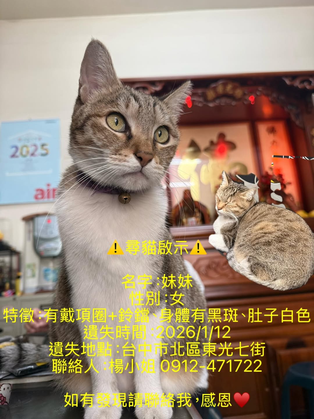 轉貼內容 #尋貓 走失日期:115/1/12 走失地點:台中市北區東光七街 因為家裡做生意,她都自由進出 1/12出門後就沒有回家了… 麻煩有看到或是撿到的麻煩通知我! 感恩… https://twpetsearch.arlinks.net/2026/01/north-taichung_20.html
