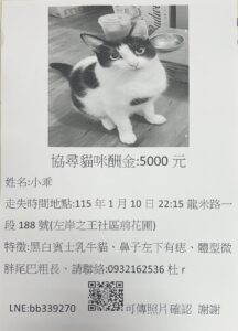 協尋貓咪酬金:5000 元…