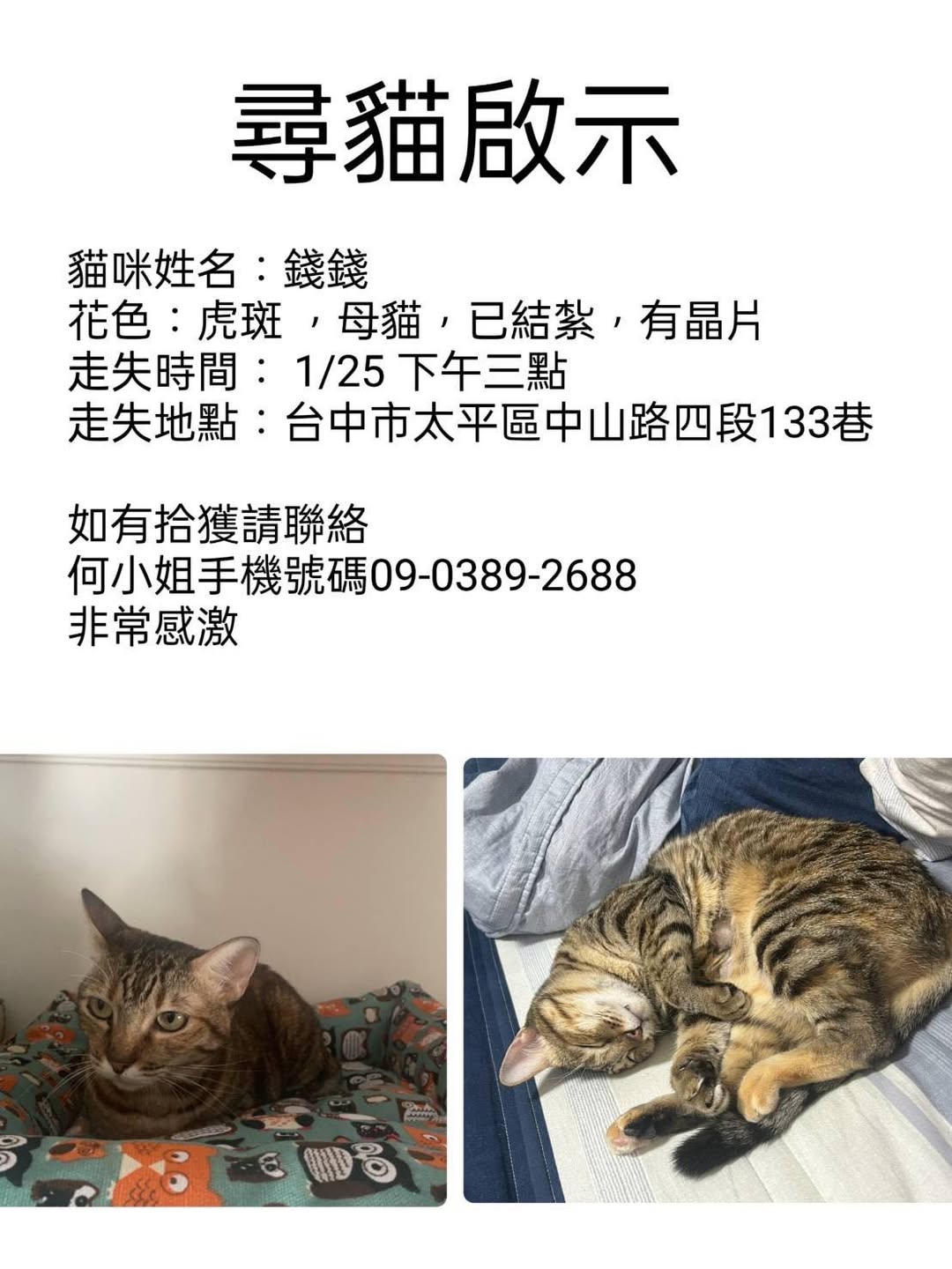 【尋找貓咪~錢錢 地點 台中市太平區】
