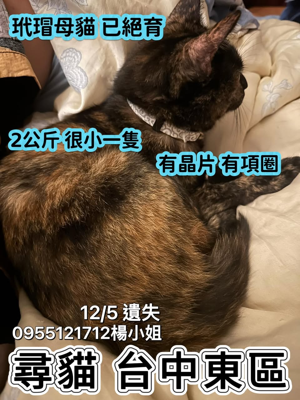 【尋找貓咪~黑寶 地點 台中市東區】 轉貼內容 🔰貓咪協尋 台中 姓名:黑寶 品種:玳瑁 母(已絕育、有晶片) 特徵:有...