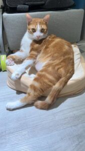 特徵:深橘色大公貓,約6公斤重,身上有螺紋,胸口跟腹部是白色的,是可愛的貓咪,怕生人,警戒心高。