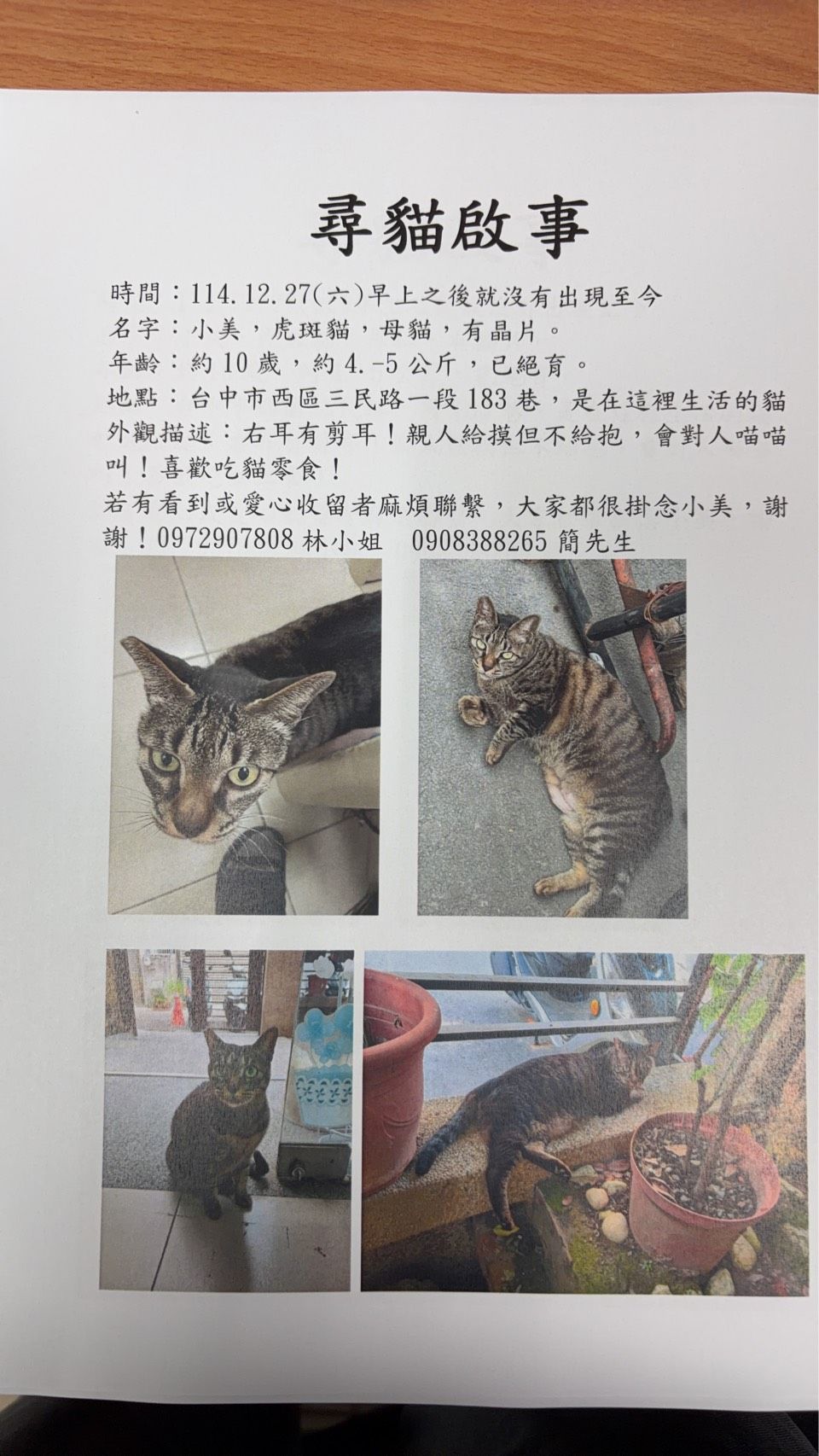 時間:114.12.27(六)早上之後就沒有出現至今 名字:小美,虎斑貓,母貓,有晶片。 年齡:約10歲,約4-5公斤,已… https://twpetsearch.arlinks.net/2026/01/west-taichung.html