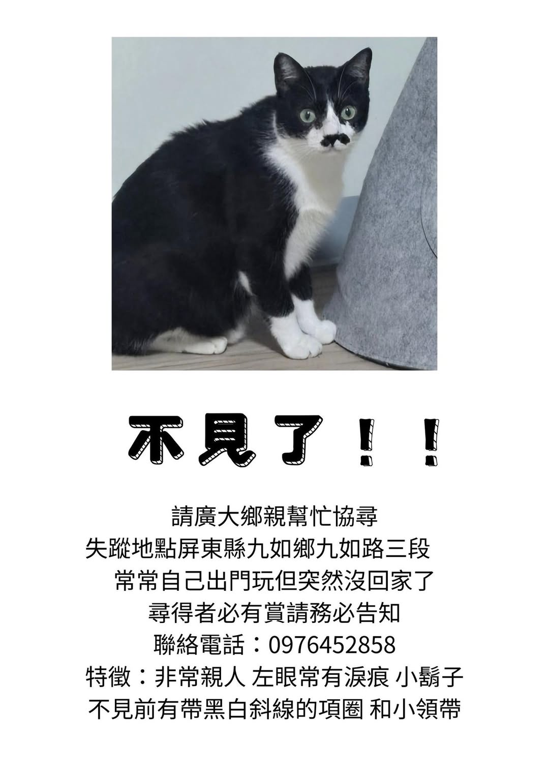 【尋找貓咪~ 地點 屏東縣九如鄉】 轉貼內容 如果有人看到我家貓咪請傳照片/影片方便我確認(提供照片/影片+地點確定為多...