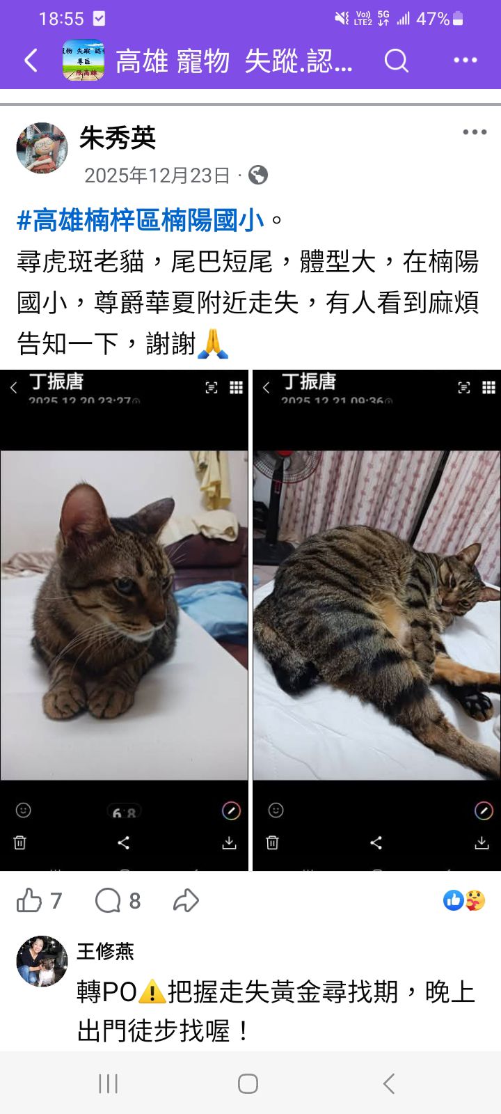 轉貼內容 #高雄楠梓區楠陽國小。 尋虎斑老貓,尾巴短尾,體型大,在楠陽國小、寧靜華夏附近走失,有人看到麻煩告知一下,謝謝🙏🙏