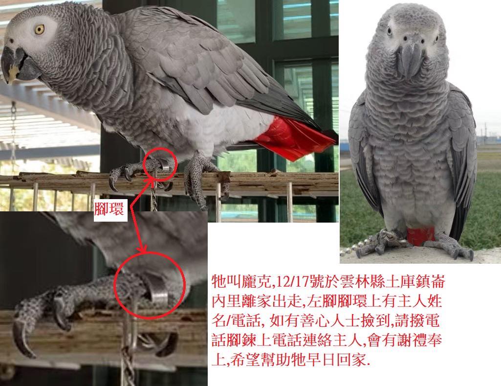 【尋找鸚鵡~ 地點 雲林縣虎尾鎮】 轉貼內容 3月22日上午大約10點多在虎尾鎮工專路新吉里安安幼稚園附近,受驚嚇扯斷脚...