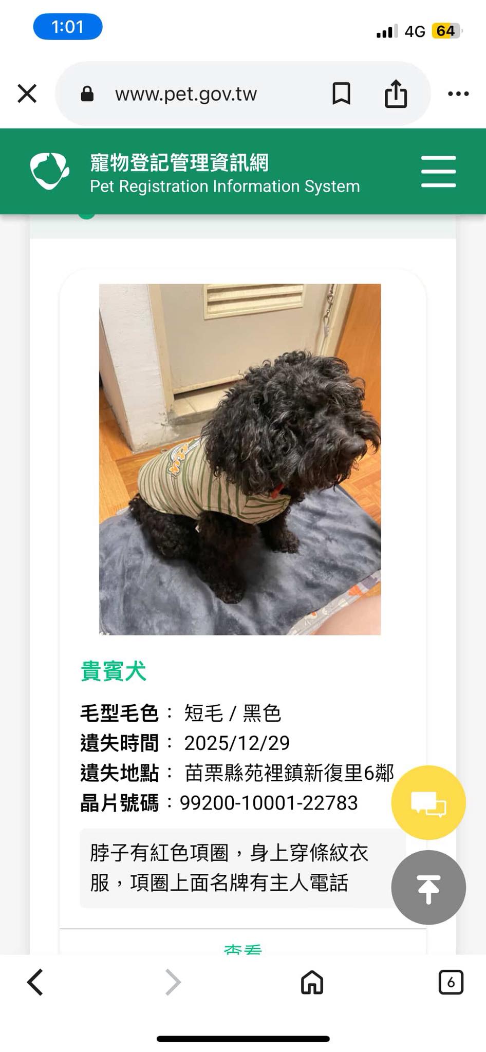 轉貼內容 兩週了⋯拜託大家多幫忙🙏 12/29走失到現在 走失地點:苗栗苑裡 新復里活動中心附近 寵物名字:仔仔 (黑貴賓失蹤穿的衣服跟照片一樣 目前懷疑是不是被… https://twpetsearch.arlinks.net/2026/01/yuanli-miaoli-poodle.html