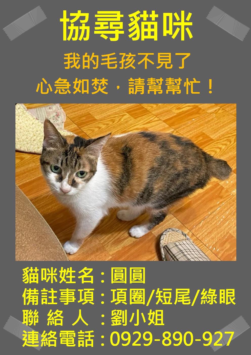 貓咪姓名:圓圓 備註事項:項圈/短尾/綠眼 聯絡人:劉小姐 聯絡電話… https://twpetsearch.arlinks.net/2025/08/xinyi-taipei_27.html