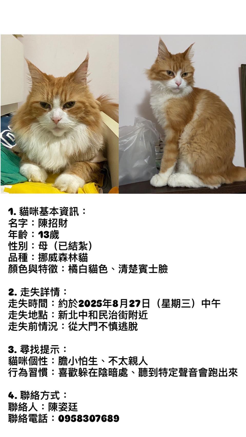 【尋找挪威森林貓~陳招財 地點 新北市中和區】