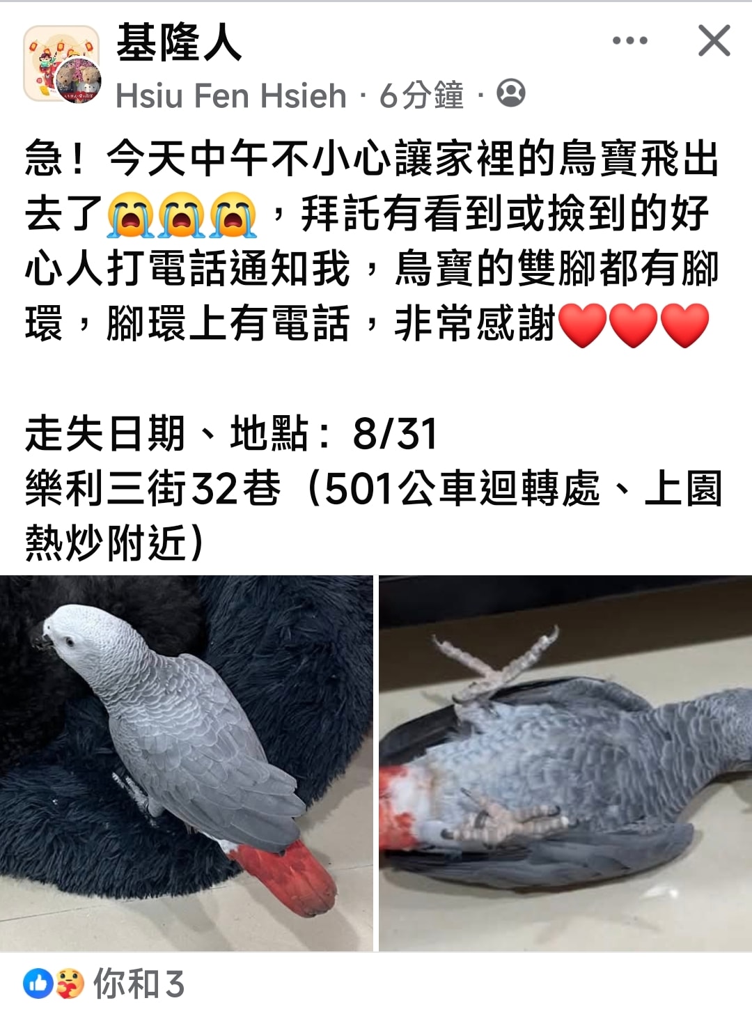 轉貼內容 急!今天中午不小心讓家裡的鳥寶飛出去😭😭😭,拜託有看到或撿到的好心人打電話通知我,鳥寶的雙腳都有腳環,腳環上有電話,… https://twpetsearch.arlinks.net/2025/09/lingya-kaohsiung-african-grey-parrot.html