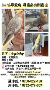 【尋找玄鳳鸚鵡~小Pinky 地點 高雄市大寮區】
