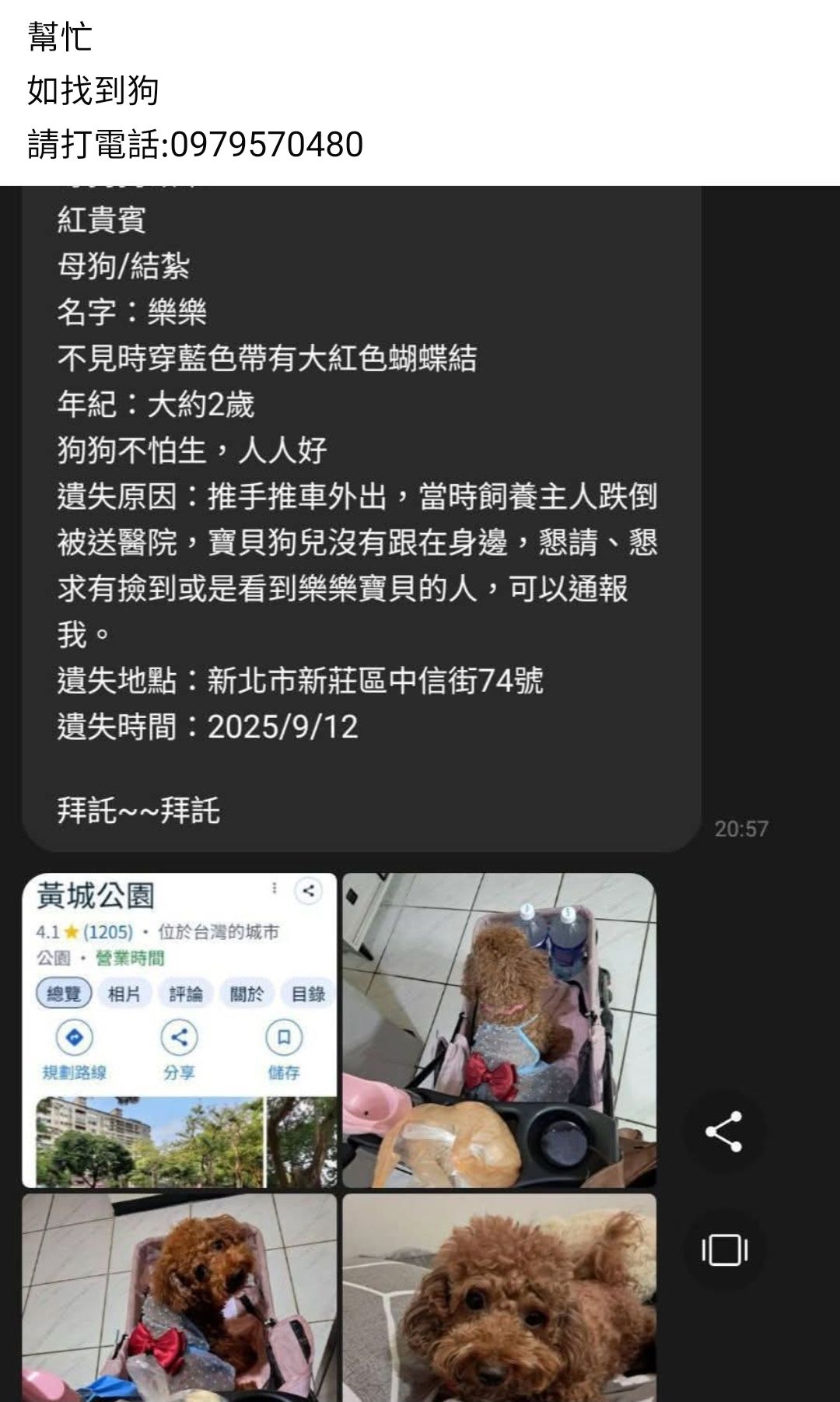 遺失原因:推手推車外出,當時飼養主人跌倒被送醫院,寶貝狗兒沒有限跟在身邊,懇請、懇求有撿到或是看到樂樂寶貝的人,可以通報我。