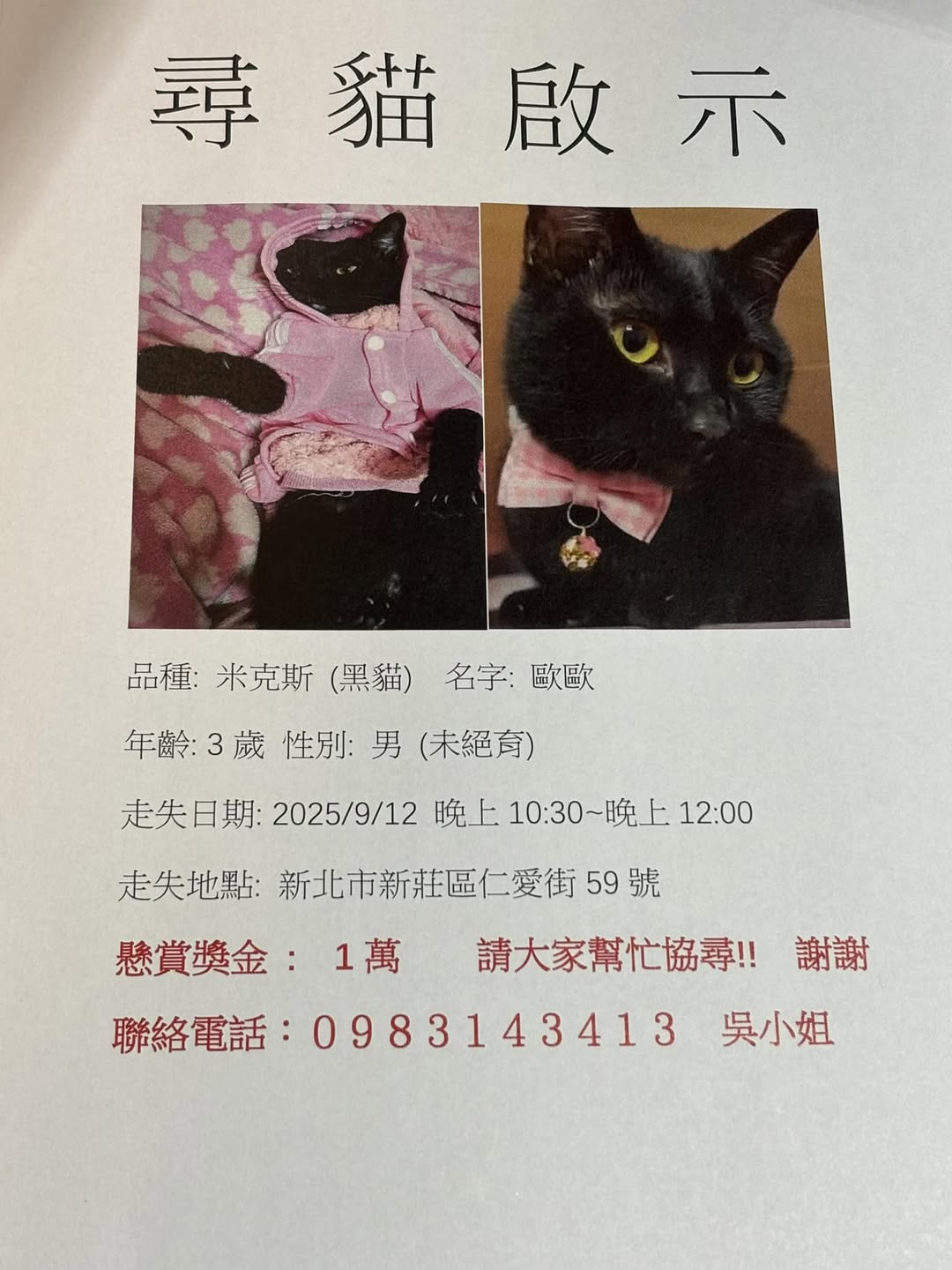 【尋找貓咪~ 地點 新北市新莊區】 轉貼內容 尋貓啟事 走失時間 113/12/03 晚上12點到12/04一點之間 走...