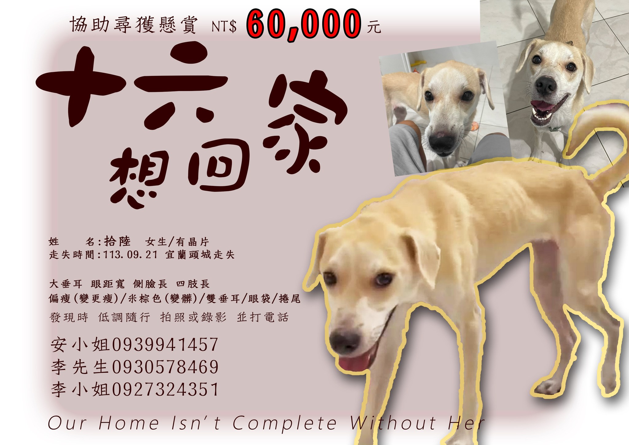 轉貼內容 協助尋獲懸賞 NT$ 60,000元 十六想回家