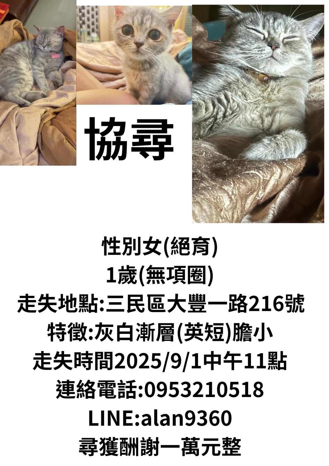 走失地點: 三民區大豐一路216號 特徵: 灰白漸層 (英短… https://twpetsearch.arlinks.net/2025/09/sanmin-kaohsiung-british-shorthair.html