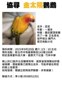 【尋找金太陽鸚鵡~泥泥 地點 新北市中和區】