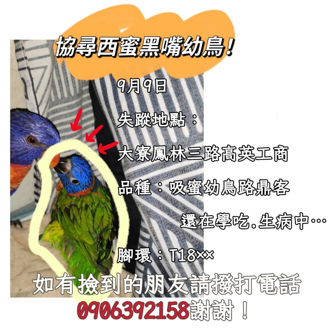【尋找吸蜜鸚鵡~蜜蜜 地點 高雄市大寮區】 轉貼內容 媽媽的鳥兒在12/1下午飛走了,如果有人剛好撿到請聯繫我,媽媽養很...