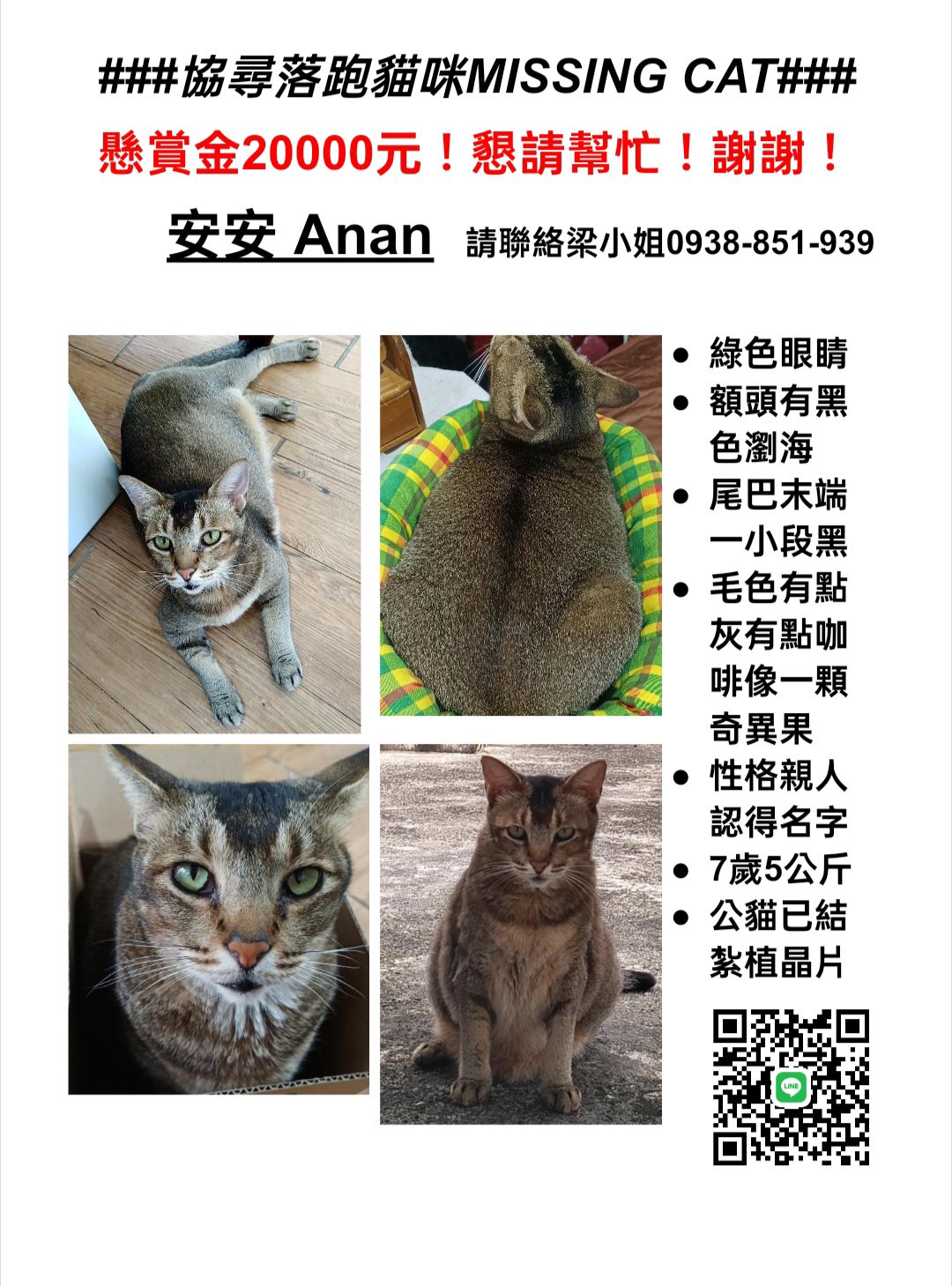 【尋找貓咪~安安 地點 花蓮縣壽豐鄉】