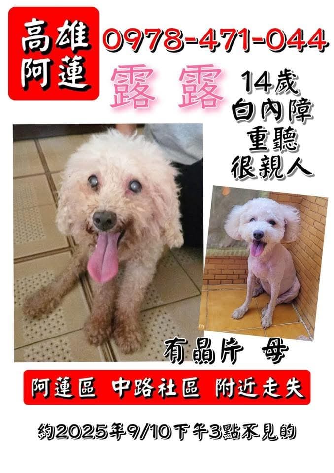 轉貼內容 急尋狗看到的人請私訊我 奶油貴賓,母,有晶片,名:露露 9/10下午3點不見的,失蹤地點在高雄中路里社區附 近,很親人,己經17歲了,有點白內障,有點… https://twpetsearch.arlinks.net/2025/09/alian-kaohsiung-poodle.html