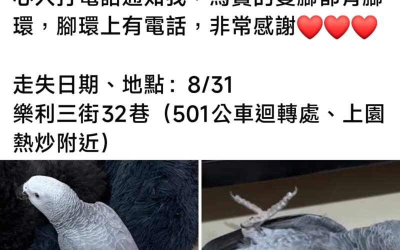 【尋找非洲灰鸚鵡~ 地點 高雄市苓雅區】 轉貼內容