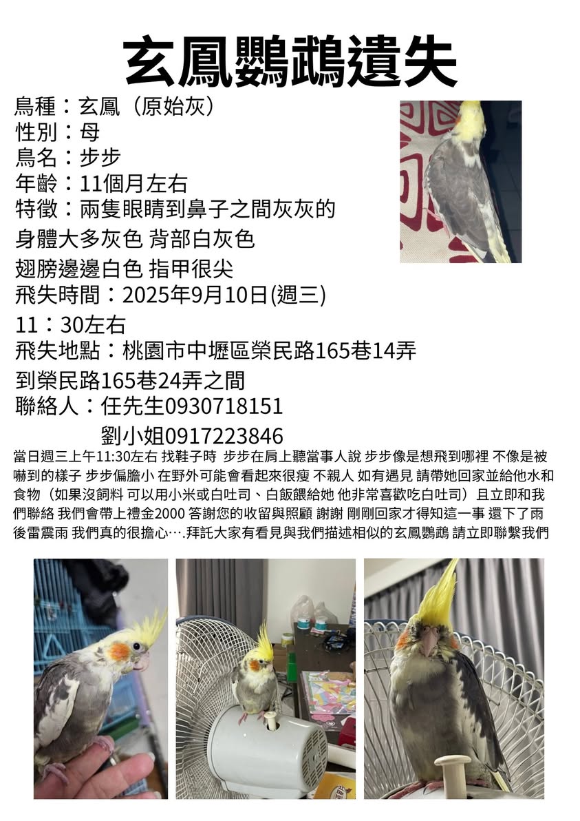 轉貼內容 尋鳥啟示 [走失玄鳳|酬金2000] 名字:步步 性別:母 腳環:綠色 飛走日:2025/9/10 地點:桃園市中壢區榮民路165巷14弄到榮… https://twpetsearch.arlinks.net/2025/10/zhongli-taoyuan-cockatiel.html