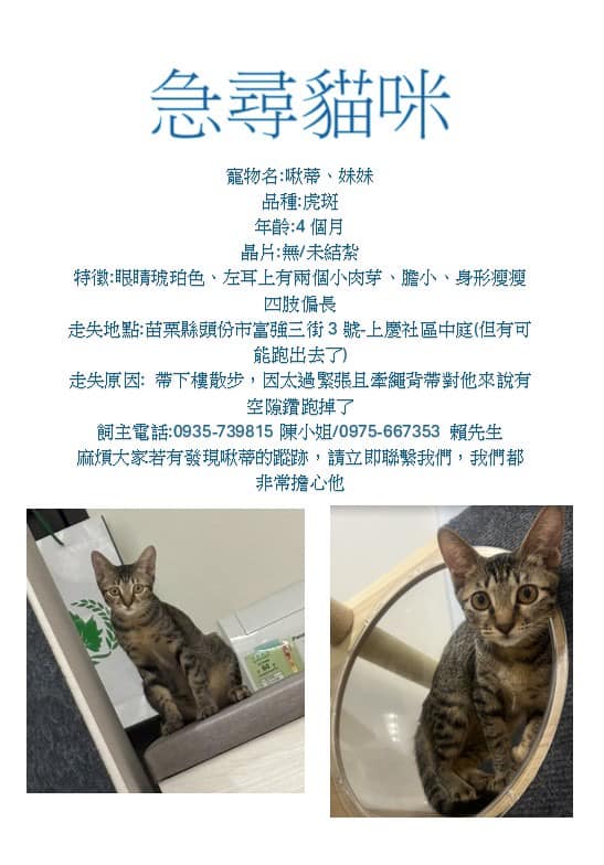 【尋找貓咪~麻糬/妹妹 地點 苗栗縣頭份市】