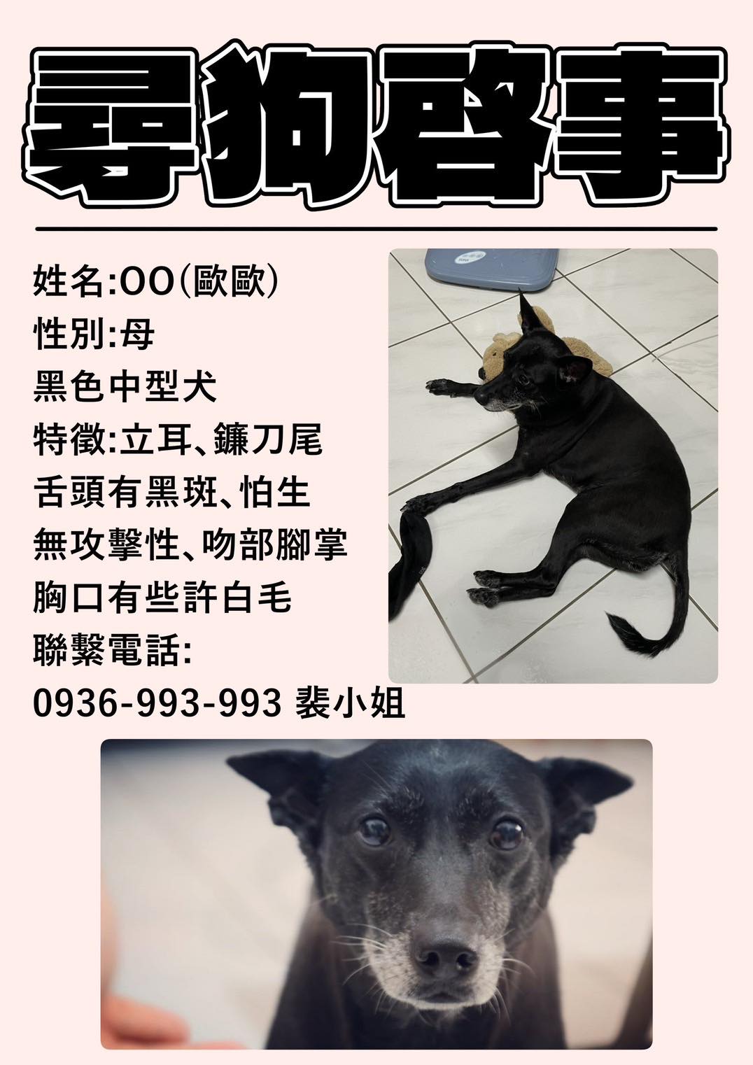轉貼內容 新北蘆洲區(蘆堤、成功國小一帶)狗狗走失了,麻煩大家如果有發現的話請聯絡我!感謝萬分 尋狗啟事 姓名:oO(歐歐) 性別:母 黑色中型犬 特徵:立耳… https://twpetsearch.arlinks.net/2025/10/oo-luzhou-new-taipei.html