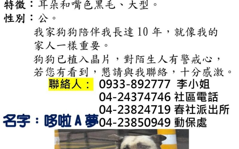 【尋找狗狗~哆啦A夢 地點 台中市南屯區】
