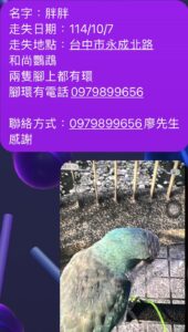 【尋找和尚鸚鵡~胖胖 地點 台中市西屯區】