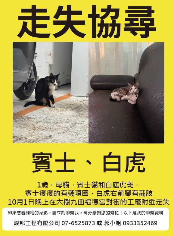 轉貼內容 <<貓咪走失協尋>> 地點:高雄大樹區新鎮路旁工廠 兩隻貓咪皆有戴項圈、也有晶片