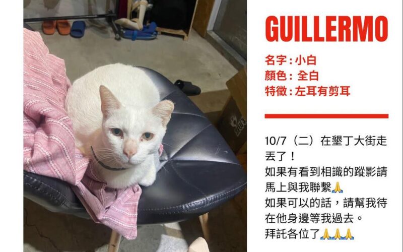 特徵:白貓 身材適中 鼻子大大的 左耳剪耳很大一片
