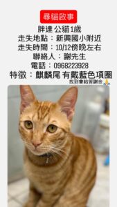 【尋找貓咪~胖達 地點 台中市北屯區】