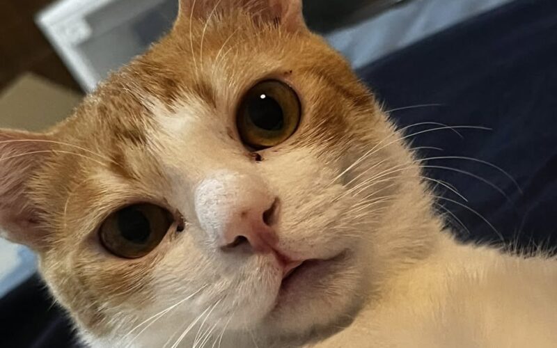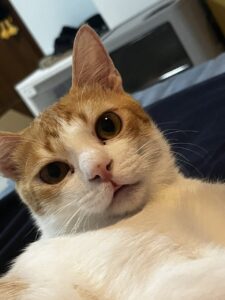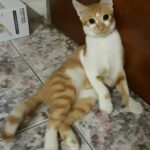 特徵:白底橘貓 身體右側有一條之前流浪受傷後 毛有點微微長不出來的痕跡 很親人 約4-5公斤 有點小肚子 已結紮有打晶片