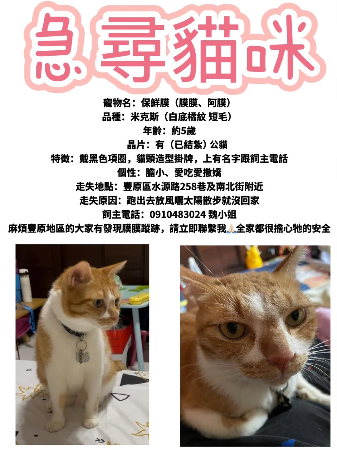 【尋找貓咪~保鮮膜 地點 台中市豐原區】