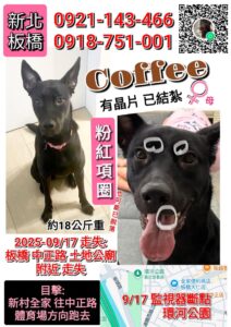 Coffee 已經走丟超過20天了⋯麻煩大家幫幫忙牠膽小不親人也不親狗但貪吃⋯3歲母狗粉色項圈眉心有白白兩點體型精瘦偏大,最有可…
