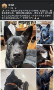 請求網友幫忙我們家黑狗熊熊在汐止姜子寮的東山國小附近走丟,有住在姜子寮附近的居民,有看到黑狗米克斯,性別女生,特徵:胸前有白色毛髮,項圈深咖啡皮質金屬,有看到居民請…