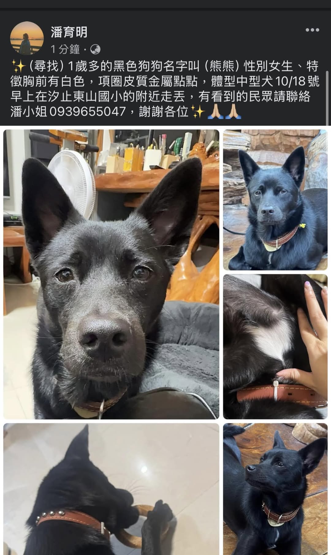 轉貼內容 請求網友幫忙我們家黑狗熊熊在汐止姜子寮的東山國小附近走丟,有住在姜子寮附近的居民,有看到黑狗米克斯,性別女生,特徵:胸前有白色毛髮,項圈深咖啡皮質金屬,有看到居民請… https://twpetsearch.arlinks.net/2025/10/xizhi-new-taipei.html