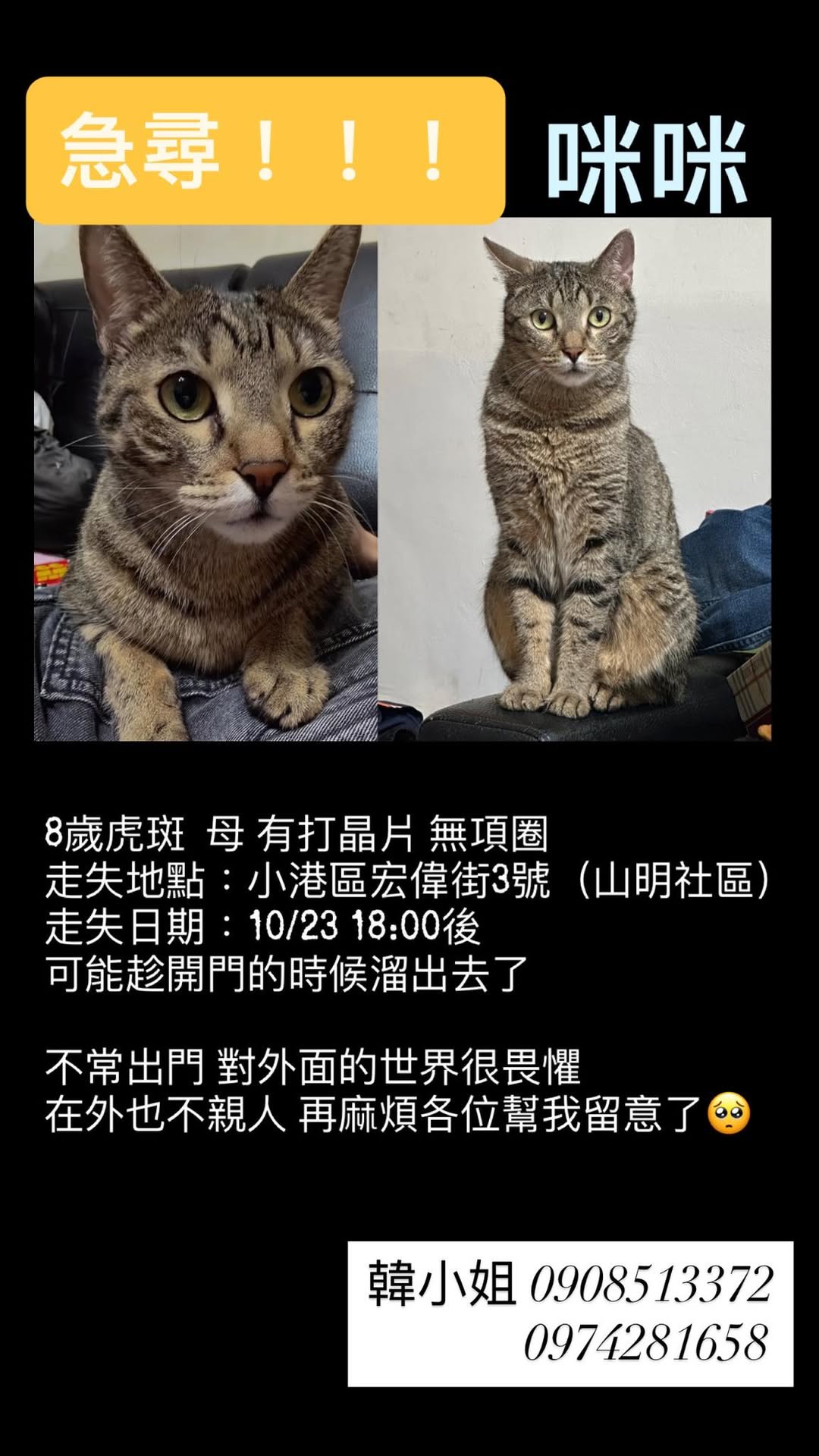 8歲虎斑 母 有打晶片 無項圈 走失地點:小港區宏偉街3號(山明社區) 走失日期:1… https://twpetsearch.arlinks.net/2025/10/xiaogang-kaohsiung.html