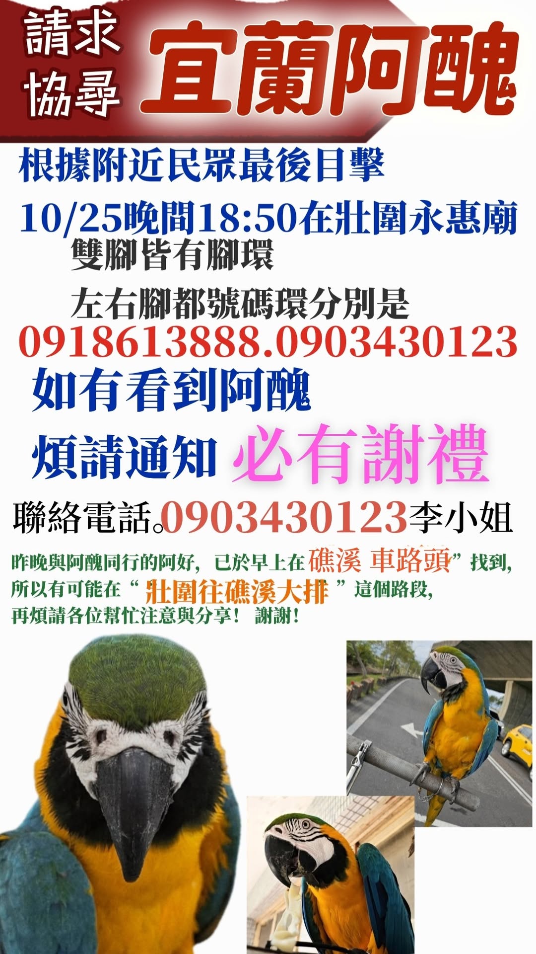 根據附近民眾最後目擊 10/25 晚間 18:50 在壯圍永惠廟 雙腳皆有腳環 左右腳都號碼環分別是 0918… https://twpetsearch.arlinks.net/2025/10/zhuangwei-yilan-parrot.html