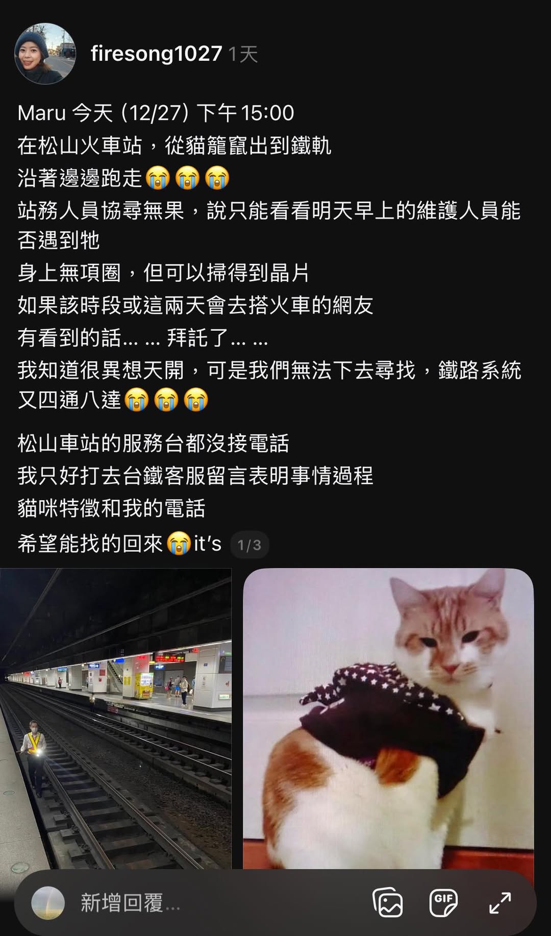 轉貼內容 Maru 今天(12/27)下午15:00 在松山火車站,從貓籠竄出到鐵軌 沿著邊邊跑走 😭😭 站務人員協尋無果,說只能看明天早上的維護… https://twpetsearch.arlinks.net/2025/10/maru-songshan-taipei.html