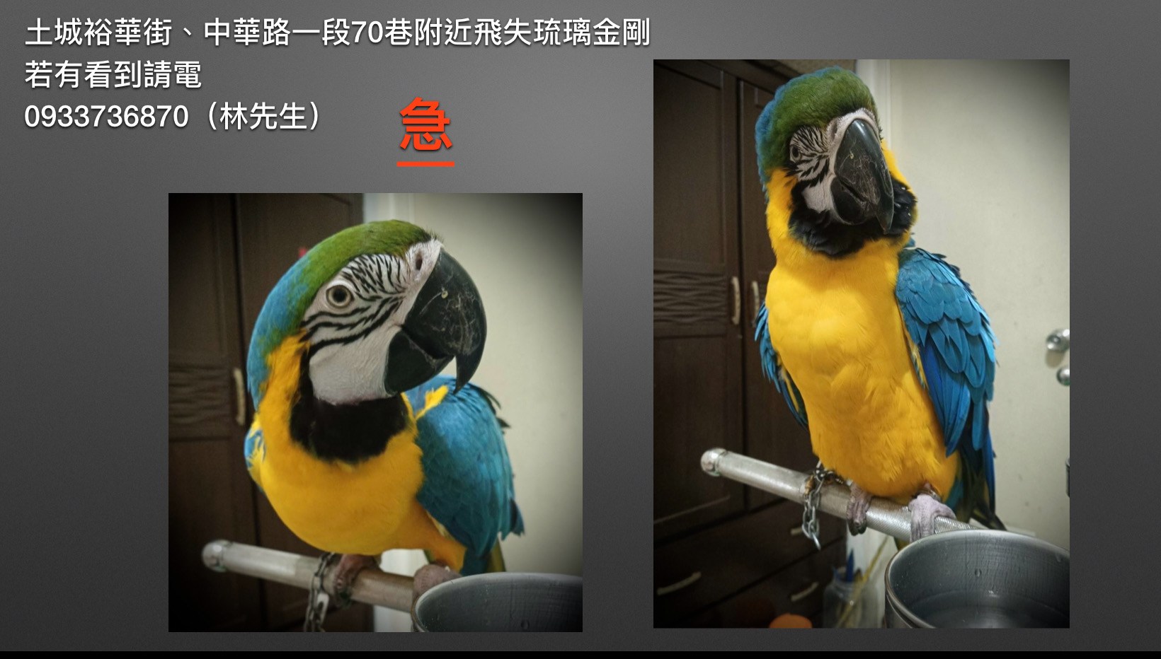 轉貼內容 飛失地點:土城裕華街 飛失時間:10/26。06:00 請大家幫幫忙 協尋金剛琉璃 如有看到請迅速聯絡 謝謝 聯絡人:0933736870 林先… https://twpetsearch.arlinks.net/2025/10/tucheng-new-taipei-macaw.html