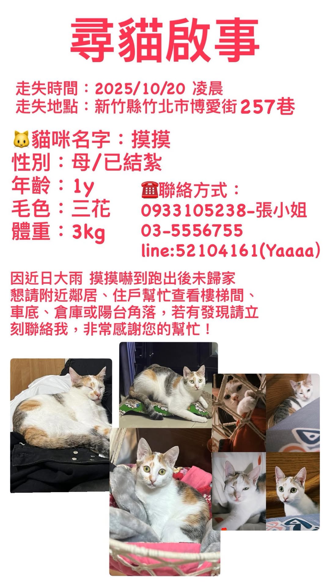 轉貼內容 ⚠️尋貓啟事⚠️ 走失時間:10/20凌晨 走失地點:新竹縣竹北市博愛街257巷 貓咪名字:摸摸 性別:母/已結紮 毛色:三花 體重:3kg 聯絡方式:09331052… https://twpetsearch.arlinks.net/2025/11/zhubei-hsinchu.html